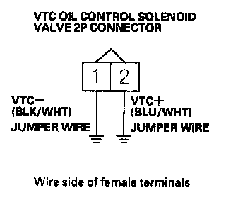 9. Connect VTC oil control solenoid valve 2P connector terminals No. 1 and No. 2 to body ground with a jumper wire individually.
