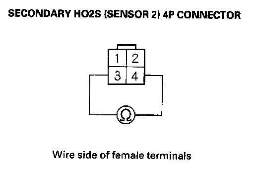 6. At the secondary HO2S (Sensor 2) side, measure resistance between HO2S 4P connector terminals;
