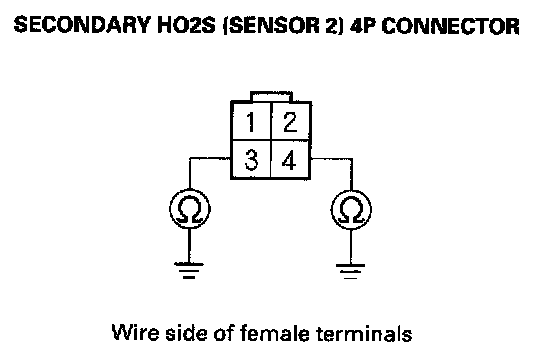 7. Check for continuity between body ground and secondary HO2S (Sensor 2) 4P connector terminals No. 3 and No. 4 individually.
