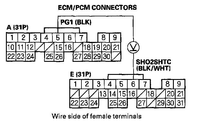 18. Measure voltage between ECM/PCM connector terminal A5 and E6.
