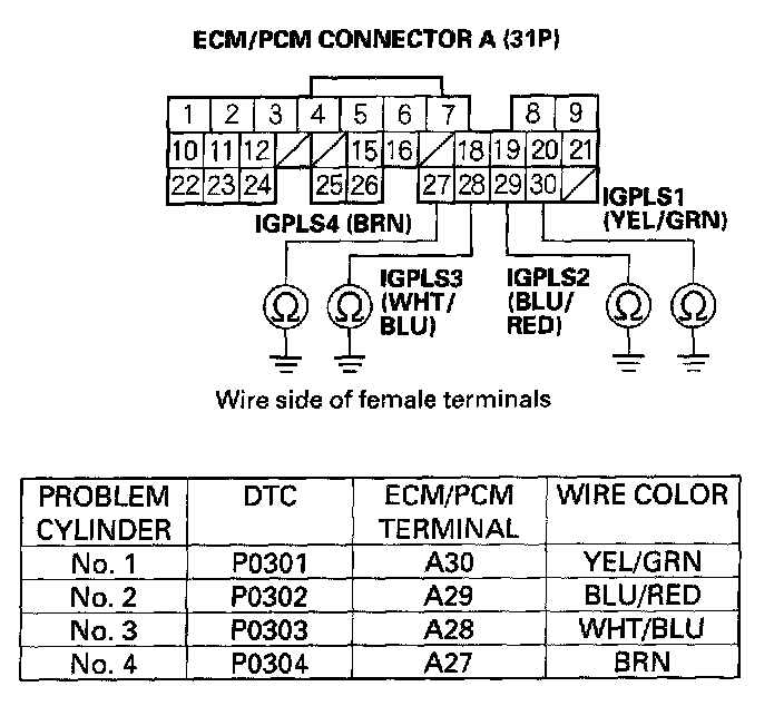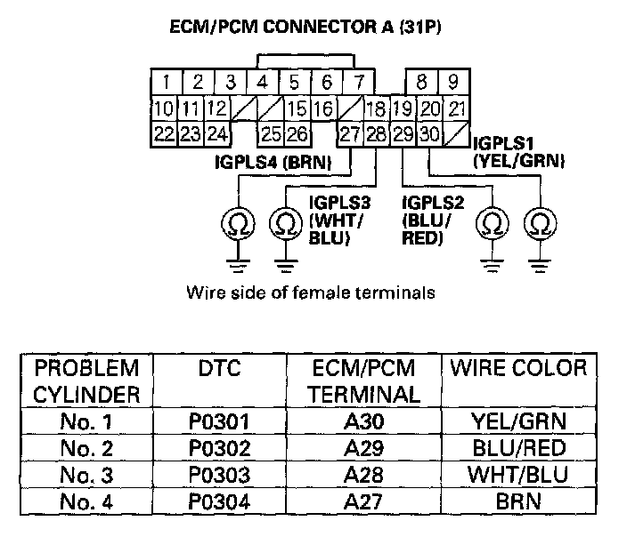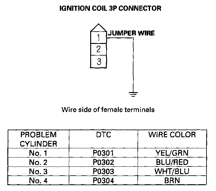 27. Connect appropriate ignition coil 3P connector terminal No. 1 to body ground with a jumper wire (see table).