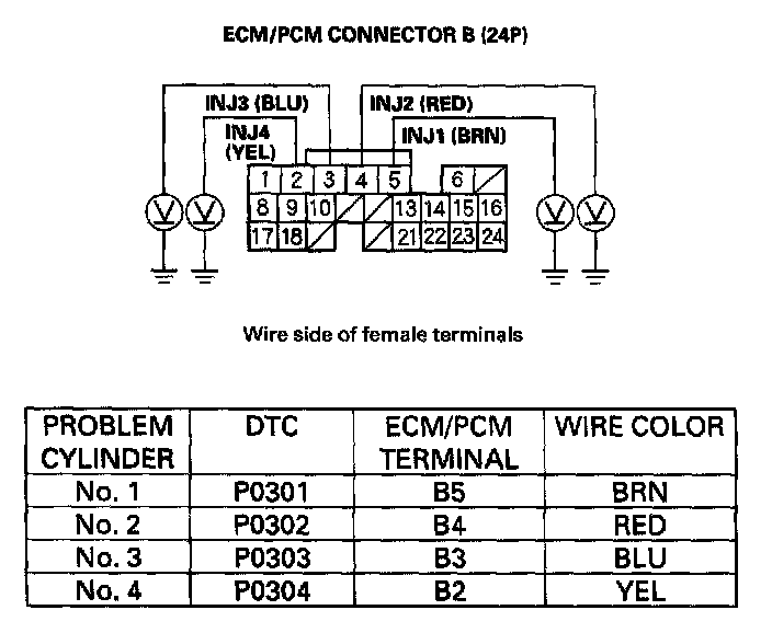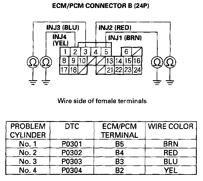 26. Check for continuity between body ground and the appropriate ECM/PCM connector terminal (see table).