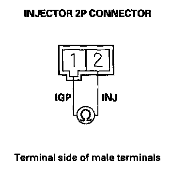 35. Measure resistance between injector 2P connector terminals No. 1 and No. 2.
