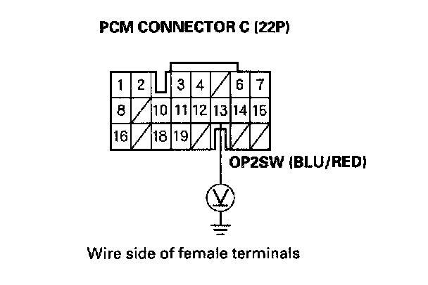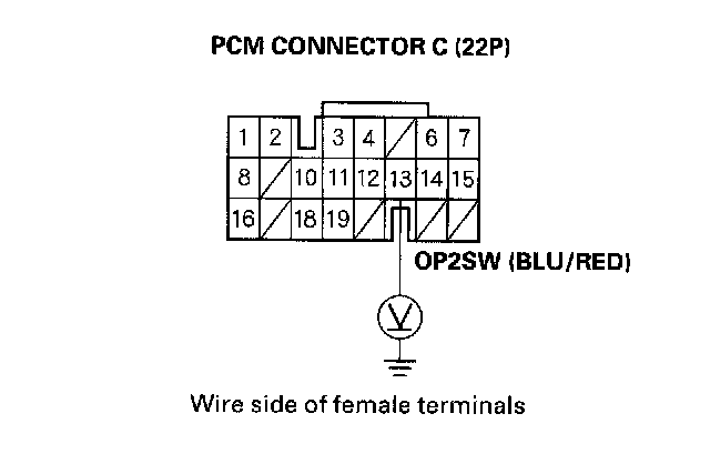 11. While driving in the [2] position, measure the voltage between PCM connector terminal C13 and body ground.