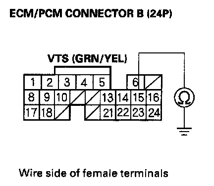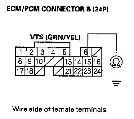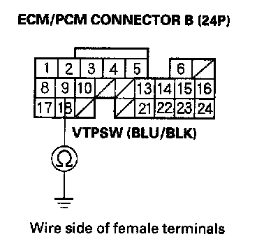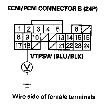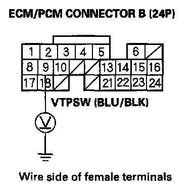 27. With the battery terminals still connected to the VTEC solenoid valve connector, measure voltage between ECM/PCM connector terminal B9 and body ground.