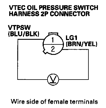 14. Measure voltage between VTEC oil pressure switch 2P connector terminals No. 1 and No. 2.