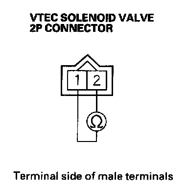 17. Check for resistance between VTEC solenoid valve 2P connector terminals No. 1 and No. 2.