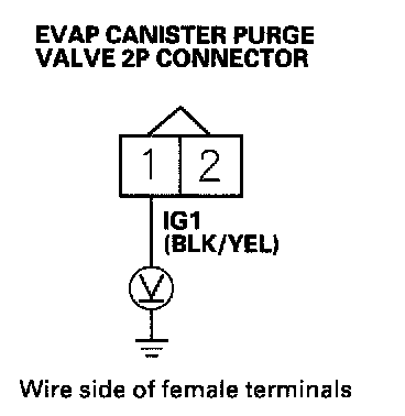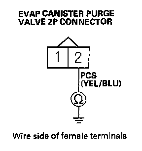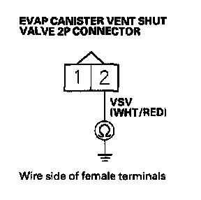 25. Check for continuity between EVAP canister vent shut valve 2P connector terminal No. 2 and body ground. If using the Honda PGM Tester to turn the EVAP canister vent shut valve ON, turn the ignition switch ON.