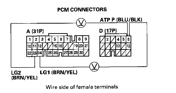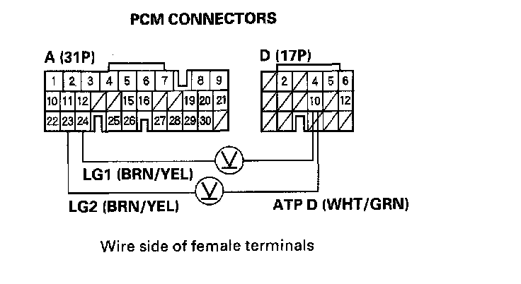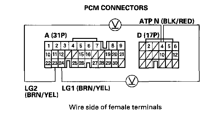 8. Measure the voltage between PCM connector terminals D6 and A23 or A24.