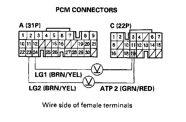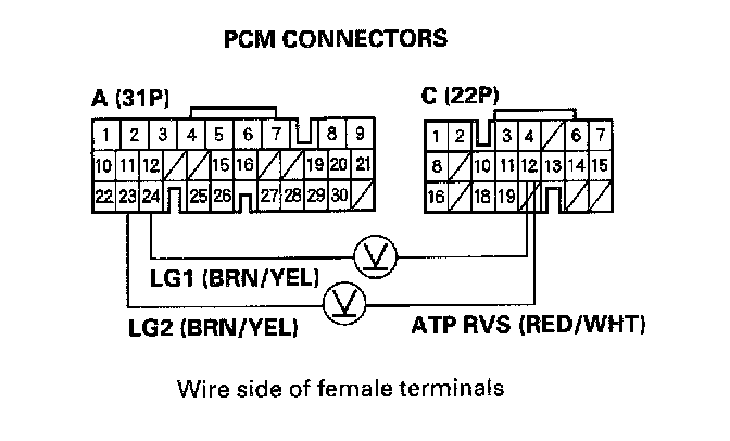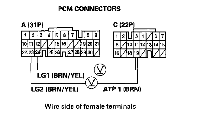 19. Measure the voltage between PCM connector terminals C19 and A23 or A24.