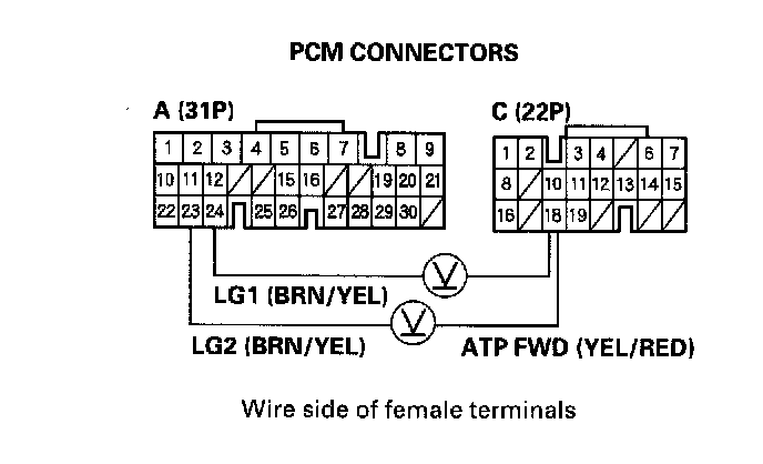 11. Measure the voltage between PCM connector terminals C12 and A23 or A24.
