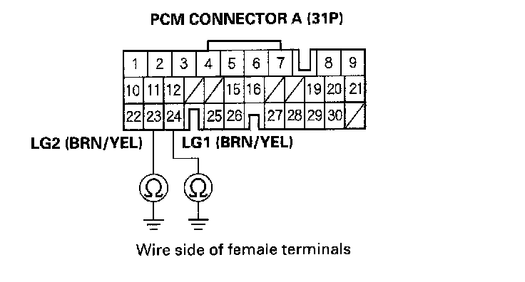 10. Check for continuity between PCM connector terminals A23 and body ground, and between A24 and body ground.