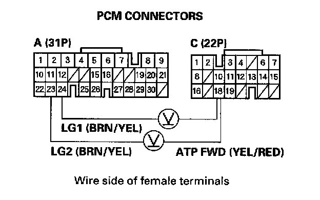 13. Measure the voltage between PCM connector terminals C18 and A23 or A24.