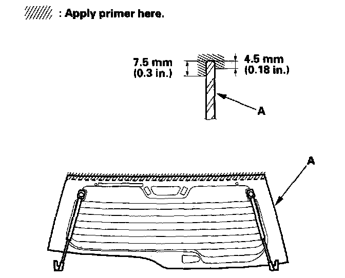 5. Apply primer (YOKOHAMA RUBBER MS-90,or equivalent) to the upper edge of the hatch glass (A). Be careful not to touch the hatch glass where primer will be applied.