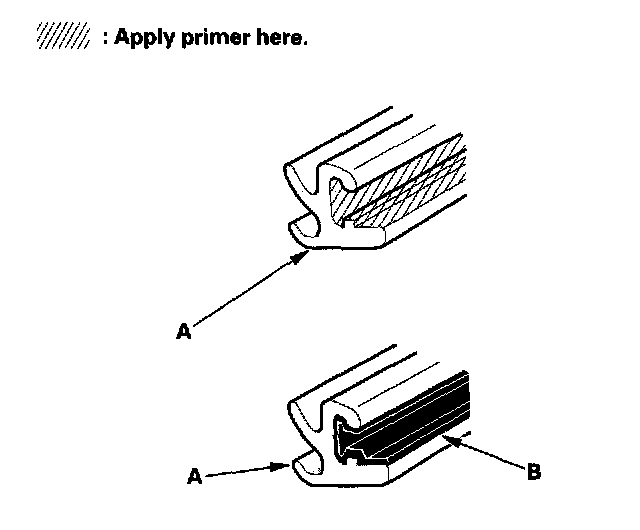 6. Apply primer (SAKAI CHEMISTRY SL-8861, or equivalent) to the entire groove of the molding (A), and run a bead of urethane adhesive (B) in the groove of the molding.