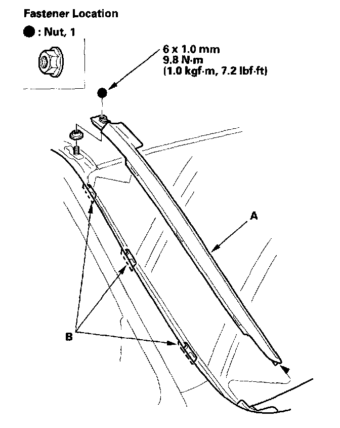2. Remove the nut, and detach the side windshield trim (A) from the retainer (B) by pulling the trim up. Take care not to scratch the body.