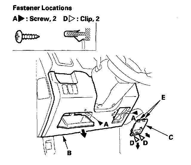 1. Remove the screws (A) from the driver's dashboard lower cover (B).