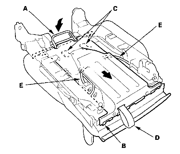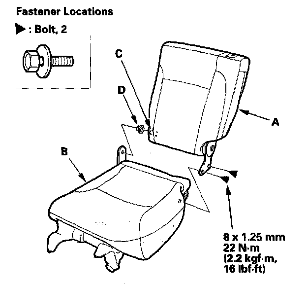 4. Remove the bolts securing the seat-back (A) and seat cushion (B), pull the center pivot (C) out from the pivot bracket, then separate them. If necessary, remove the bushing (D).
