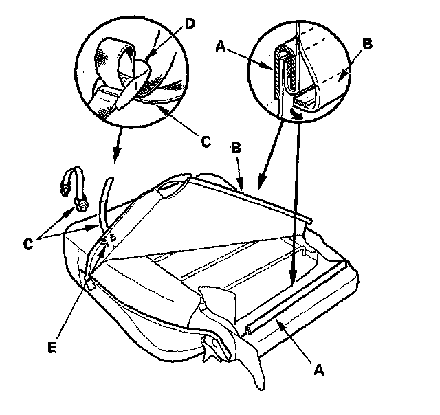 12. Remove the seat cushion cover (A) with the seat cushion pad from the seat cushion frame (B). Pass the seat belt buckle (C) through the hole in the seat cushion cover.