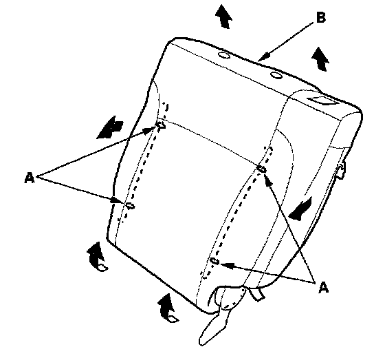 8. Pull back the edge of the seat-back cover all the way around, and release the clips (A), then remove the seat-back cover (B).