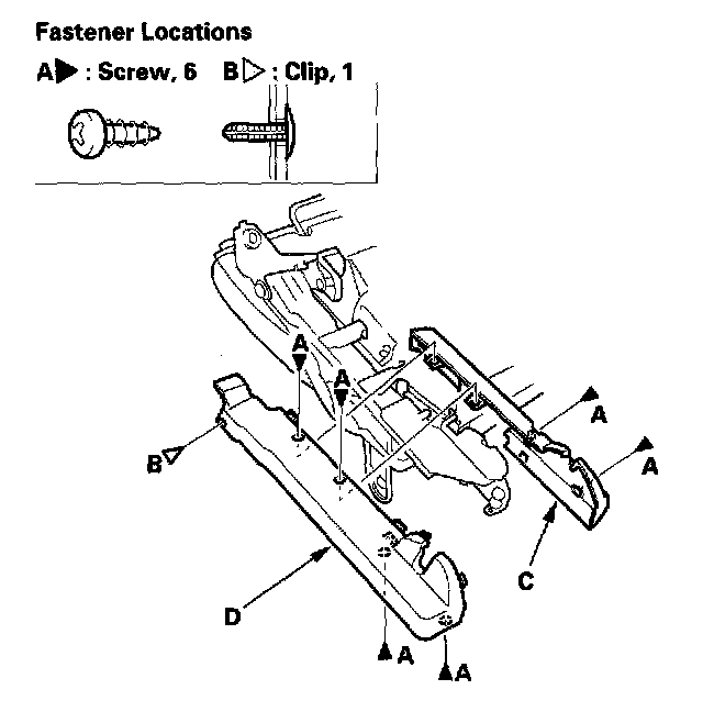 6. Remove the screws (A) and release the clips (B), then remove the inner seat track end cover B (C) and inner seat track end cover A (D).