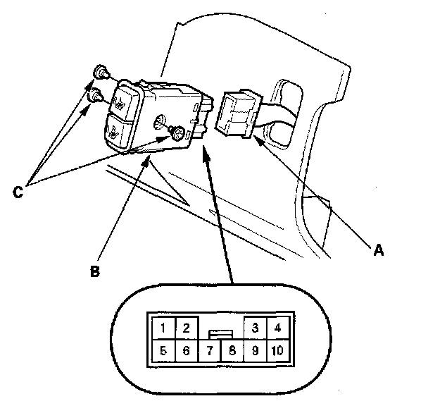 2. Disconnect the 10P connector (A) from the seat heater switch (B), and remove the seat heater switch.