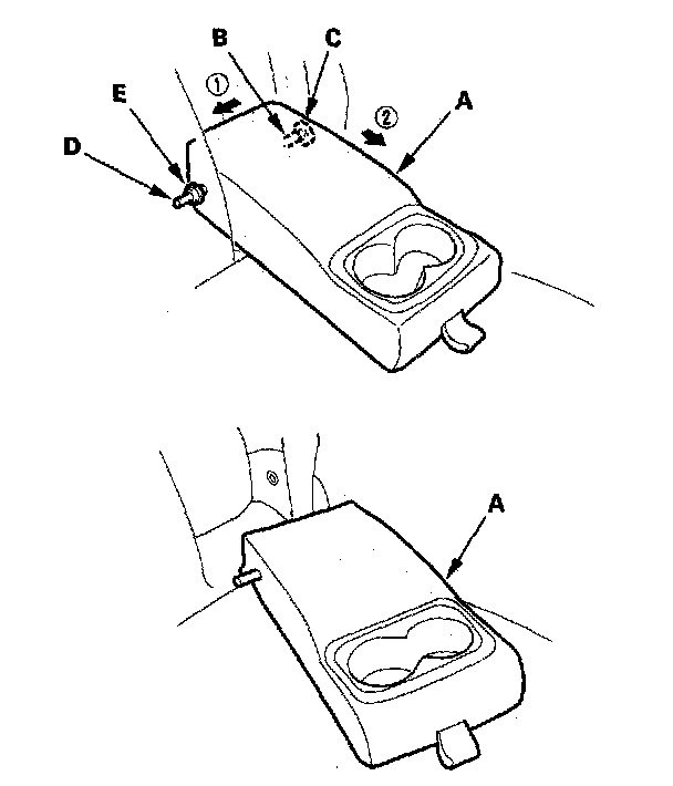 2. Remove the left pivot shaft (B) from the collar (C), and remove the right pivot shaft (D) from the collar (E) by pulling the armrest back.
