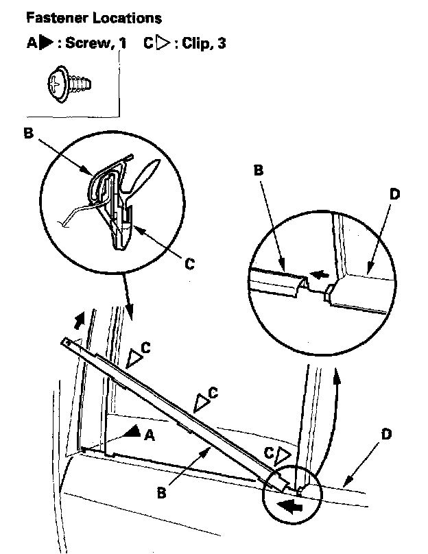 1. Remove the screw (A) from the front edge of the door. Starting at the front, pry the door glass outer weatherstrip (B) up to detach the clips (C), and release the weatherstrip from the door quarter glass seal (D), then remove it.
