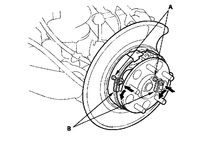 1. Apply Molykote 44 MA grease to the sliding surface of the pivot pin (A), and insert the pin into the rearward brake shoe (B).