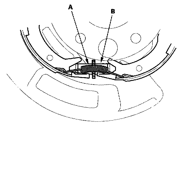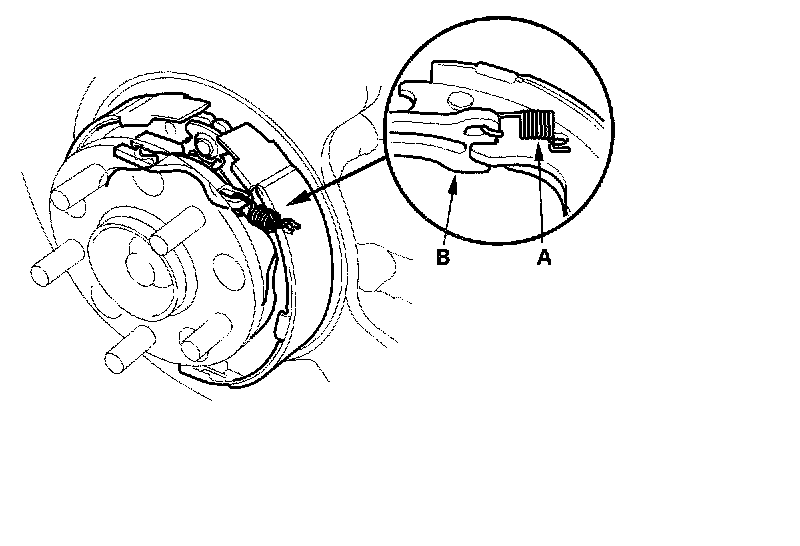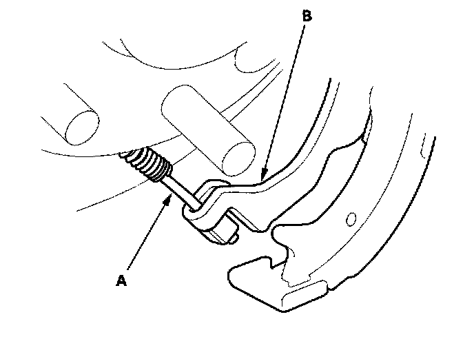 7. Remove the forward brake shoe by removing the lower return spring (A) and adjuster assembly (B).