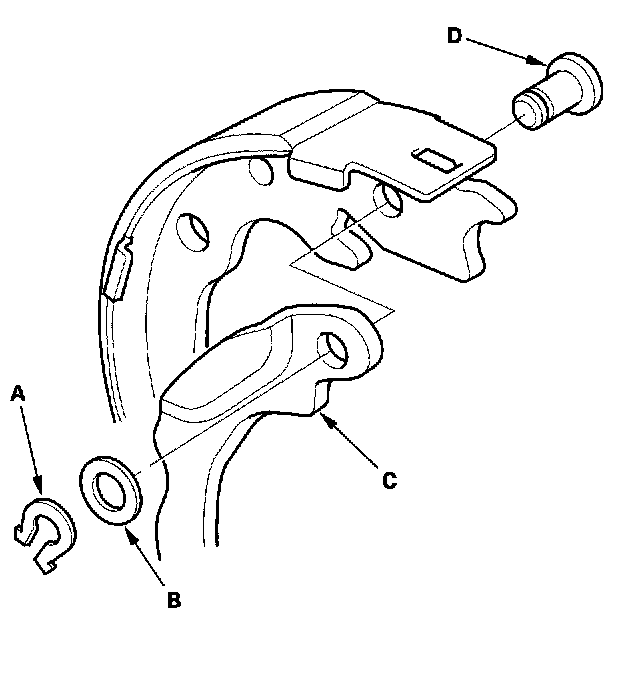 9. Remove the U-clip (A), wave washer (B), parking brake lever (C), and pivot pin (D) from the brake shoe.