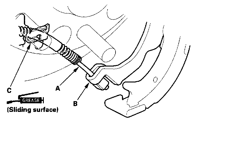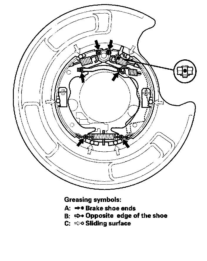 4. Apply Molykote 44 MA grease to the shoe ends (A), sliding surfaces (B), and opposite edges of the parking brake shoe (C) as shown. Wipe off any excess. Don't get grease on the brake linings.