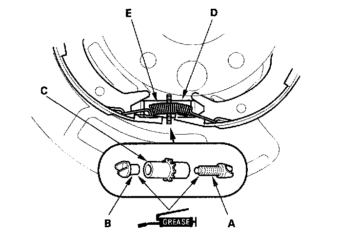 6. Reinstall the brake shoe adjuster assembly (D), and hook the lower return spring (E) on the parking brake shoes.