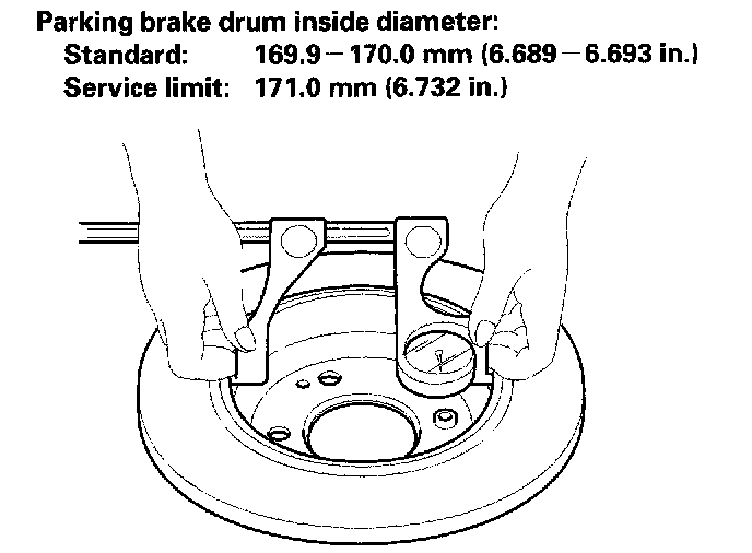8. If the inside diameter of the parking brake drum is more than service limit, replace the rear brake disc/drum.