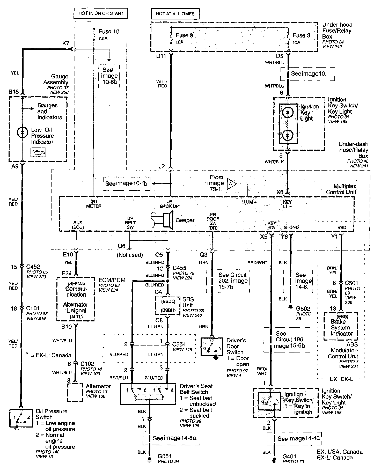 Lights-on, Key-in, And Seat Belt Reminders, Key Light Timer, And Low Oil Pressure Indicator Image 73-1: