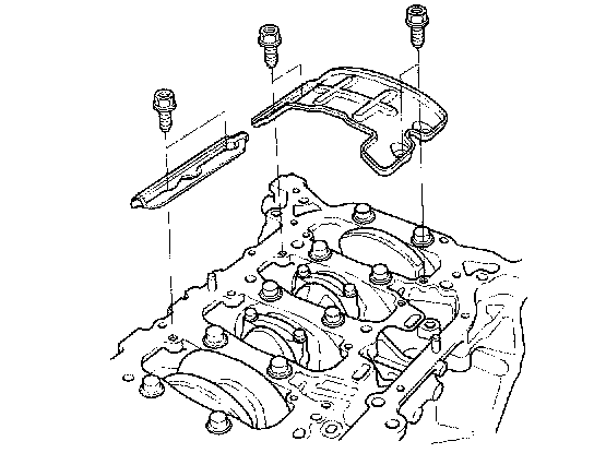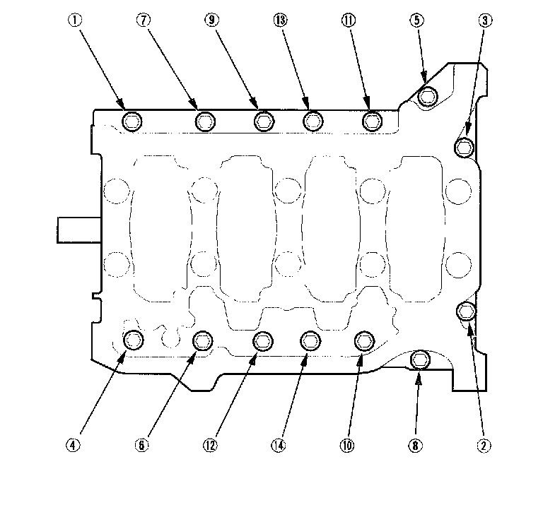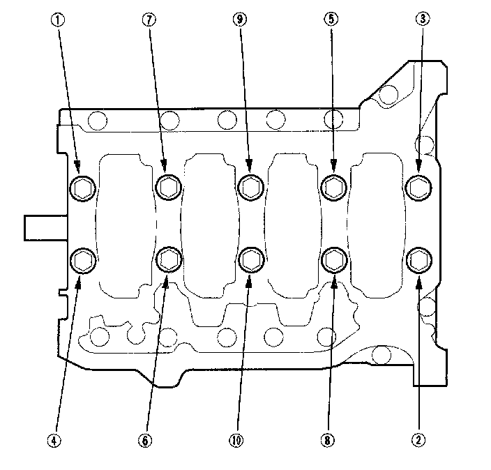 8. Remove the bearing cap bolts. To prevent warpage, unscrew the bolts in sequence 1/3 turn at a time: repeat the sequence until all bolts are loosened.