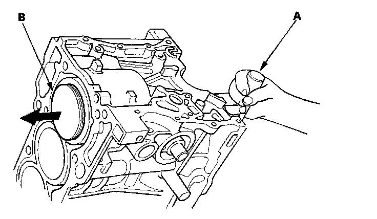 14. Use the wooden handle of a hammer (A) to drive out the pistons (B).