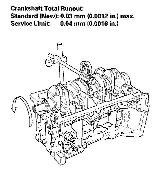 9. Measure runout on all main journals. Rotate the crankshaft two complete revolutions. The difference between measurements on each journal must not be more than the service limit.