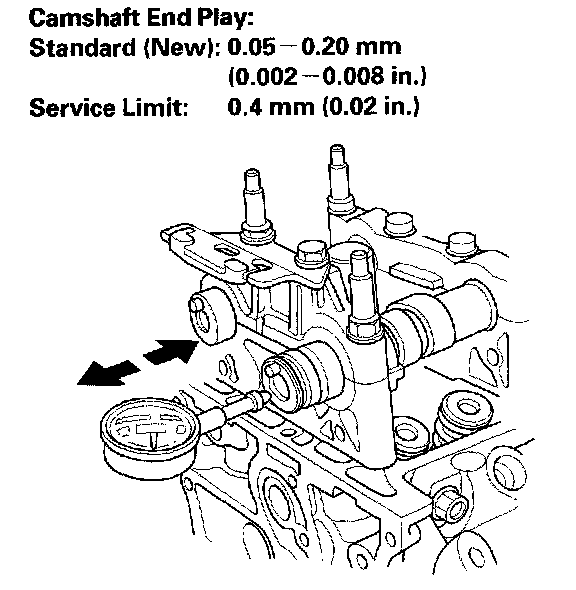 4. Zero the dial indicator against the end of the camshaft, then push the camshaft back and forth and read the end play. If the end play is beyond the service limit, replace the cylinder head and recheck. If it is still beyond the service limit, replace the camshaft.