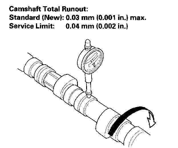 - If the total runout is beyond the service limit, replace the camshaft and recheck the camshaft to-holder oil clearance. If the oil clearance is still beyond the service limit, replace the cylinder head.