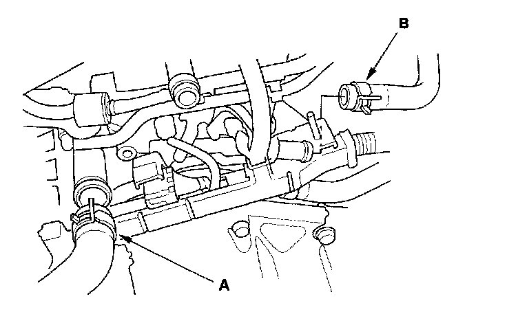 10. Remove the upper radiator hose (A) and heater hose (B)