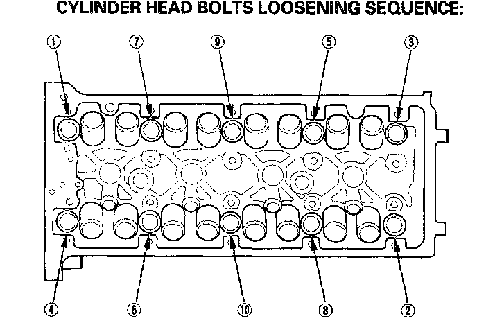 14. Remove the cylinder head bolts. To prevent warpage, unscrew the bolts in sequence 1/3 turn at a time; repeat the sequence until all bolts are loosened.