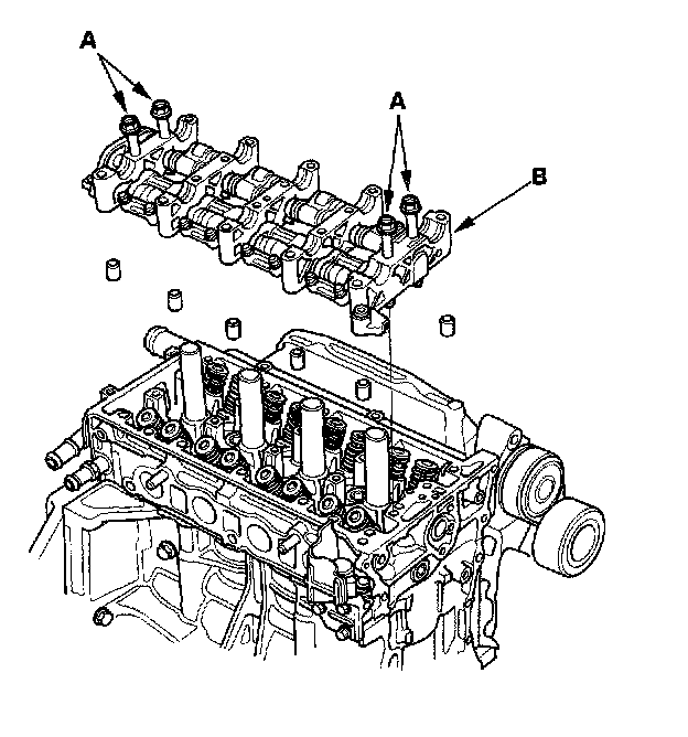 4. Insert the bolts (A) into the rocker shaft holder, then install the rocker arm assembly (B) on the cylinder head.