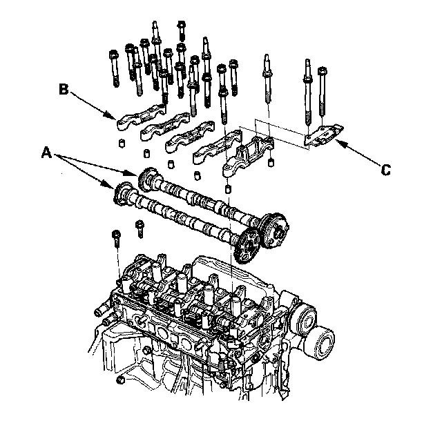 7. Set the camshaft holders (B) and cam chain guide B (C) in place.