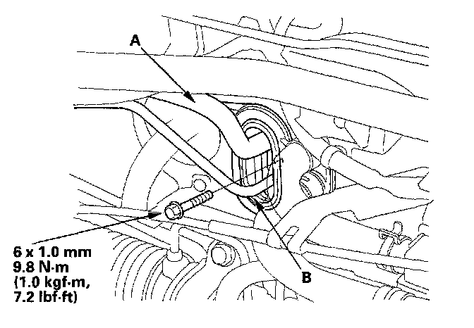 2. Remove the bolt, then disconnect the suction line (A) and the receiver line (B) from the evaporator core.