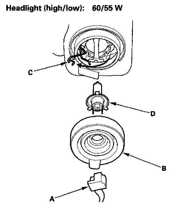 3. Pull the retaining spring (C) away from the bulb (D), then remove the bulb.
