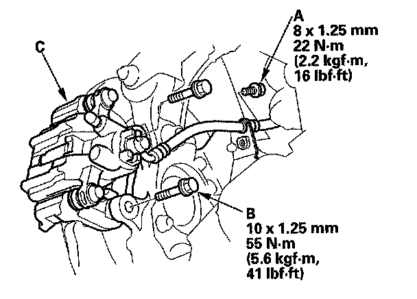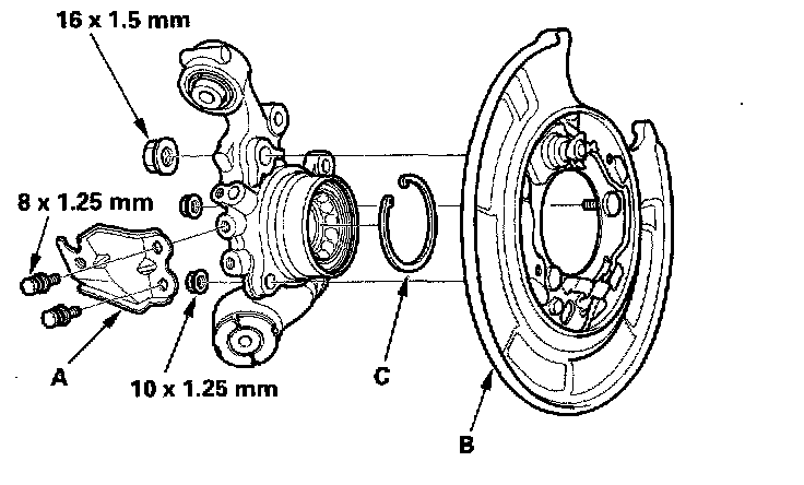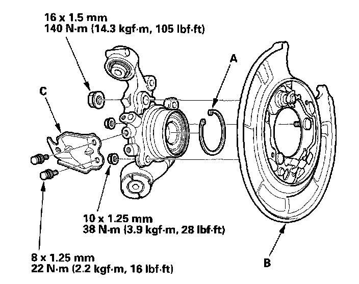 8. Install the snap ring (A), backing plate (B), and brake hose mounting bracket (C). Tighten the flange nuts and bolts to the specified torque.