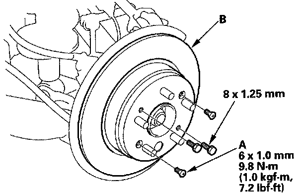 5. Remove the brake disc retaining screw (A), and screw two 8 x 1.25 mm bolts into the brake disc/ drum (B) to push it away from the hub. Turn each bolt two turns at a time to prevent cocking the brake disc/drum excessively. Remove the brake disc/drum.