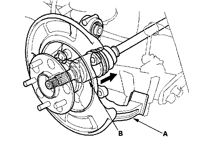 14. Remove the knuckle (A) while pushing in the driveshaft and holding the driveshaft outboard joint (B) (4WD only).