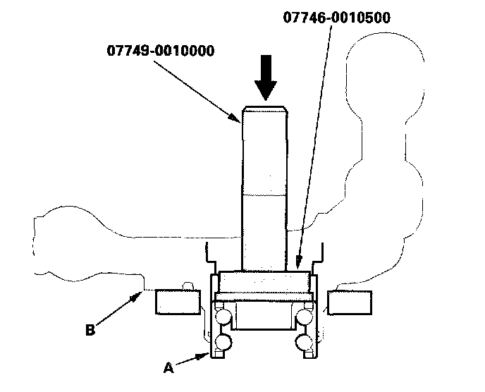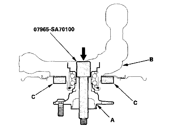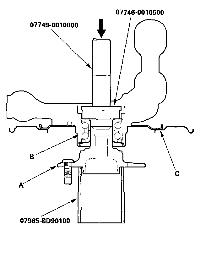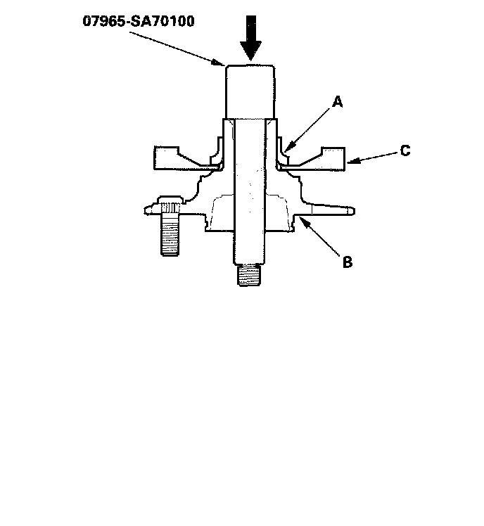 1. Separate the hub (A) from the knuckle (B) using the special tool and a hydraulic press. Hold the knuckle with a press attachment (C) or equivalent tool. Be careful not to deform the splash guard. Hold onto the hub to keep it from falling when pressed clear.